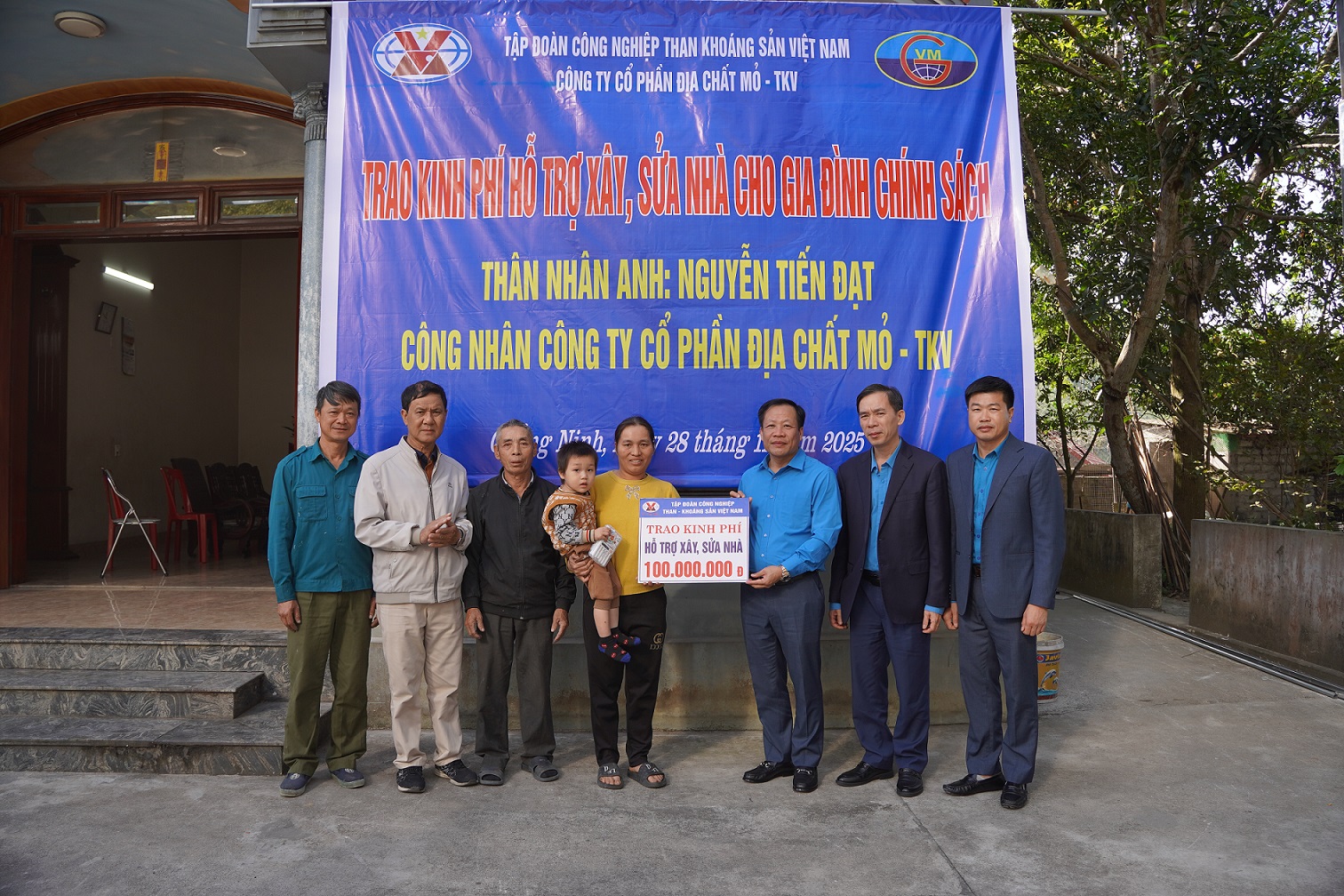 Ngày 28/11/2025, đồng chí Nguyễn Trung Hiếu, Phó Chủ tịch Công đoàn Than - Khoáng sản Việt Nam (TKV) cùng đại diện các Ban chuyên đề Công đoàn TKV đã tới thăm, trao tiền hỗ trợ sửa nhà cho các gia đình chính sách của Công ty CP Địa chất mỏ.