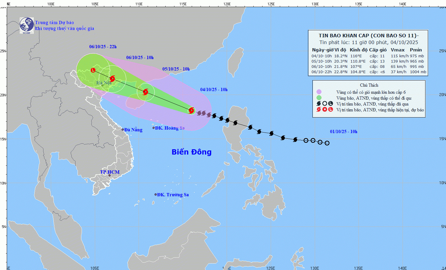 Theo dự báo mới nhất từ Trung tâm Dự báo Khí tượng Thủy văn Quốc gia, đến 07 giờ ngày 05/10, bão MATMO tiếp tục với cường độ mạnh, có thể đạt Cấp 12, giật Cấp 15 trên vùng biển phía Tây Bắc khu vực Bắc Biển Đông; Đến 07 giờ ngày 06/10, bão dự kiến đi vào khu vực Bắc Vịnh Bắc Bộ và suy yếu dần xuống Cấp 10, giật Cấp 13, ảnh hưởng trực tiếp đến khu vực Đông Bắc Bắc Bộ.