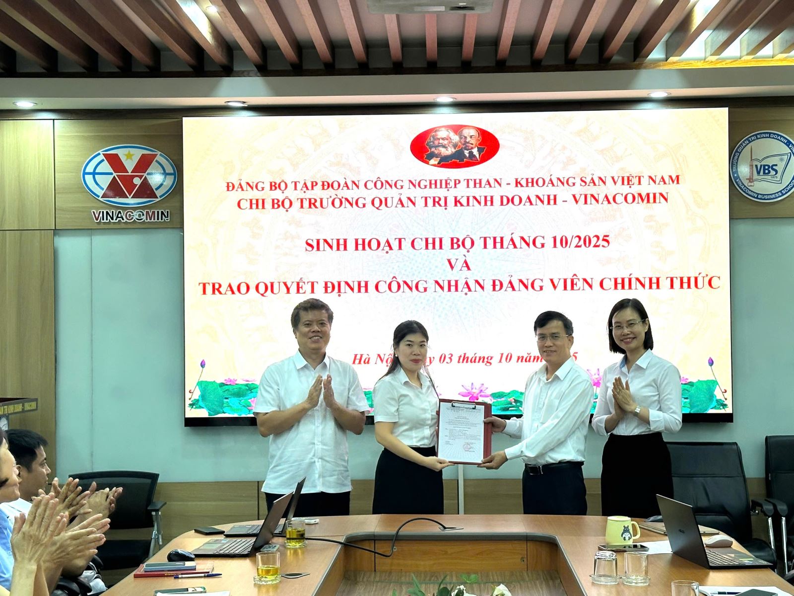 Trọng tâm của buổi sinh hoạt là công tác xây dựng và phát triển Đảng. Tại đây, Chi bộ đã long trọng tổ chức lễ trao Quyết định công nhận đảng viên chính thức cho đồng chí Lê Thị Mai Phương - cán bộ phòng Đào tạo. Sau 12 tháng dự bị, với sự phấn đấu không ngừng trong chuyên môn và rèn luyện phẩm chất chính trị, đồng chí Phương đã vinh dự được chính thức đứng trong hàng ngũ của Đảng. Sự kiện này không chỉ là niềm tự hào của cá nhân đồng chí mà còn khẳng định hiệu quả trong công tác bồi dưỡng, phát triển đảng viên của Chi bộ VBS.