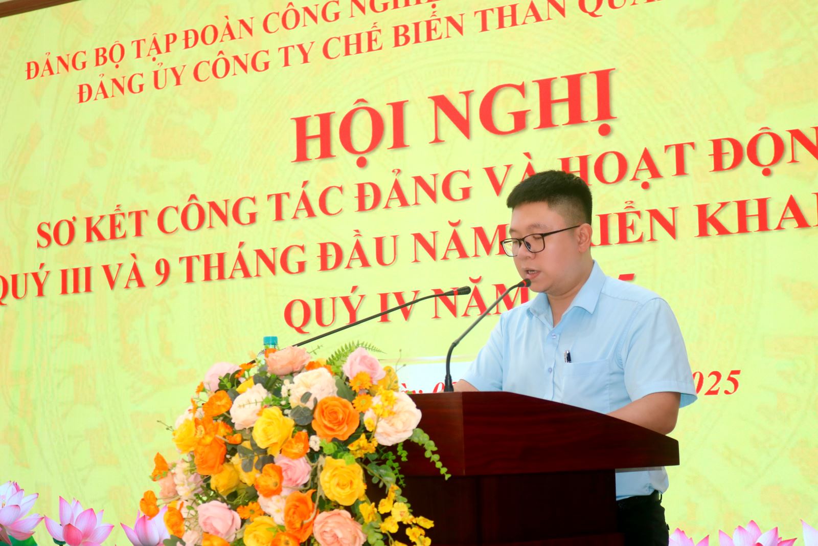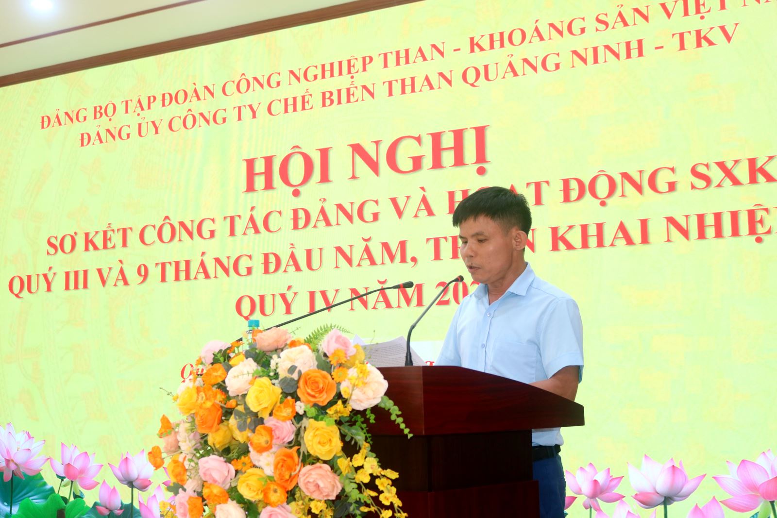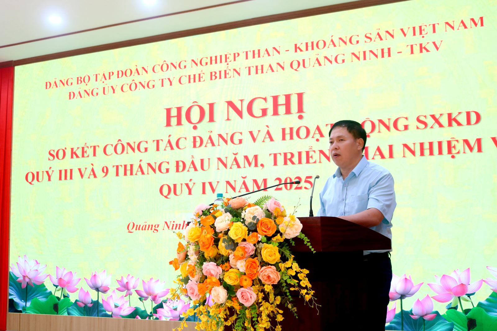 Chiều ngày 03/10/2025, Đảng uỷ Công ty Chế biến than Quảng Ninh đã tổ chức hội nghị sơ kết công tác Đảng và hoạt động sản xuất kinh doanh quý III và 9 tháng đầu năm, triển khai nhiệm vụ quý IV năm 2025. Đồng chí Bùi Quang Huy - Bí thư Đảng ủy, Giám đốc Công ty chủ trì Hội nghị.