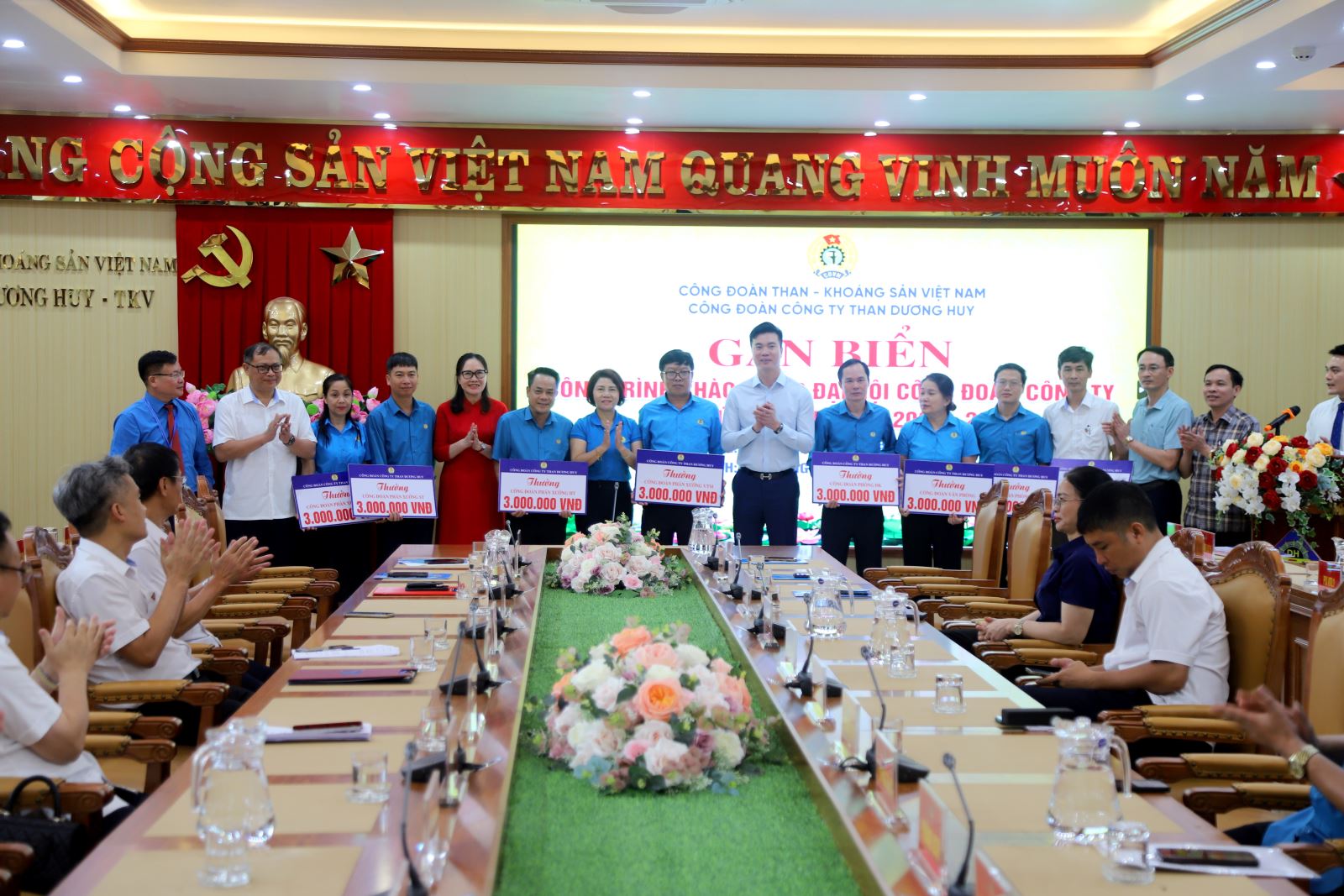 Đồng chí Nguyễn Thị Minh - Phó Chủ tịch Công đoàn TKV cùng các đồng chí lãnh đạo Công ty khen thưởng các đơn vị đã nỗ lực hoàn thành công trình đúng tiến độ