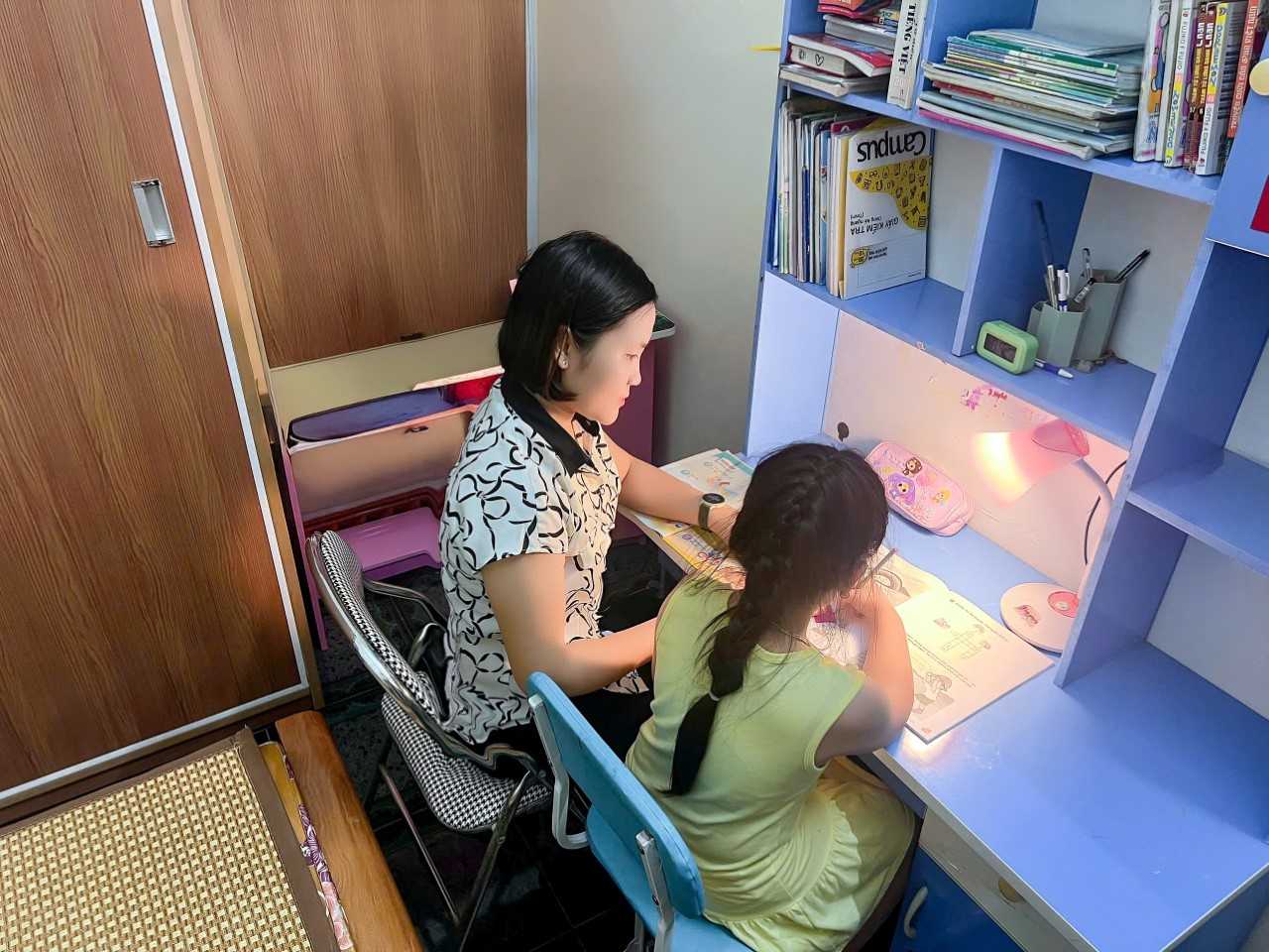 Ngoài giờ làm việc, chị Duyên dành thời gian để bảo ban con học, chăm lo cho gia đình