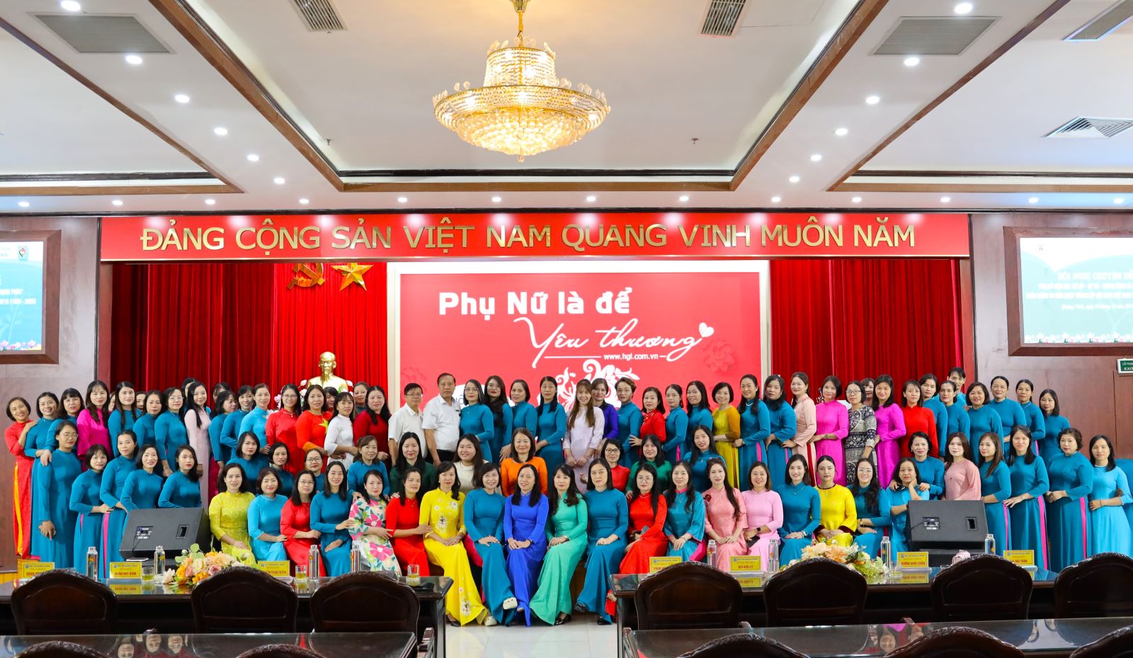 Các đại biểu và nữ CNVCLĐ tiêu biểu chụp ảnh lưu niệm tại hội nghị