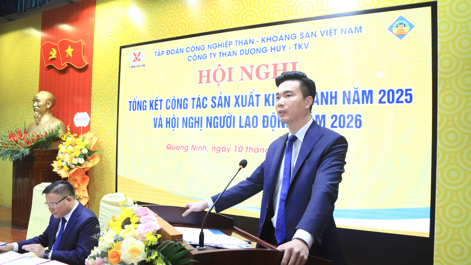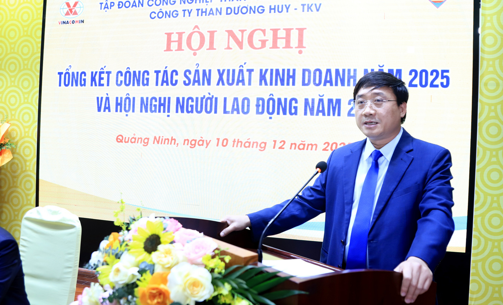 Phát biểu chỉ đạo tại Hội nghị, đồng chí Phan Xuân Thủy - Phó Tổng Giám đốc Tập đoàn TKV đánh giá cao, ghi nhận và biểu dương một năm hoàn thành xuất sắc toàn diện mọi nhiệm vụ của Than Dương Huy và đề nghị: Năm 2026, Công ty cần tập trung chỉ đạo quyết liệt 09 nhóm giải pháp trọng tâm để duy trì công suất thiết kế mỏ 2,5 triệu tấn hầm lò trong nhiều năm tới; Tăng cường quản trị rủi ro trong công tác quản lý để đảm bảo hiệu quả sản xuất kinh doanh; Tích cực triển khai Đề án chuyển đổi số, đẩy nhanh tiến độ phương án xuống sâu, tiết kiệm chi phí sản xuất trong giai đoạn chuyển giao giữa 2 tầng -100 và -250. Đặc biệt quan tâm cải thiện điều kiện, môi trường làm việc, đảm bảo an toàn để thu hút giữ chân người lao động; Tiếp tục duy trì đoàn kết nội bộ, phát huy truyền thống văn hóa thợ mỏ “Kỷ luật và Đồng tâm”, chăm lo đời sống người lao động chu đáo trong dịp Tết sắp tới, tạo nền tảng vững chắc khẳng định uy tín vị thế một Công ty sản xuất than hầm lò lớn của Tập đoàn TKV.