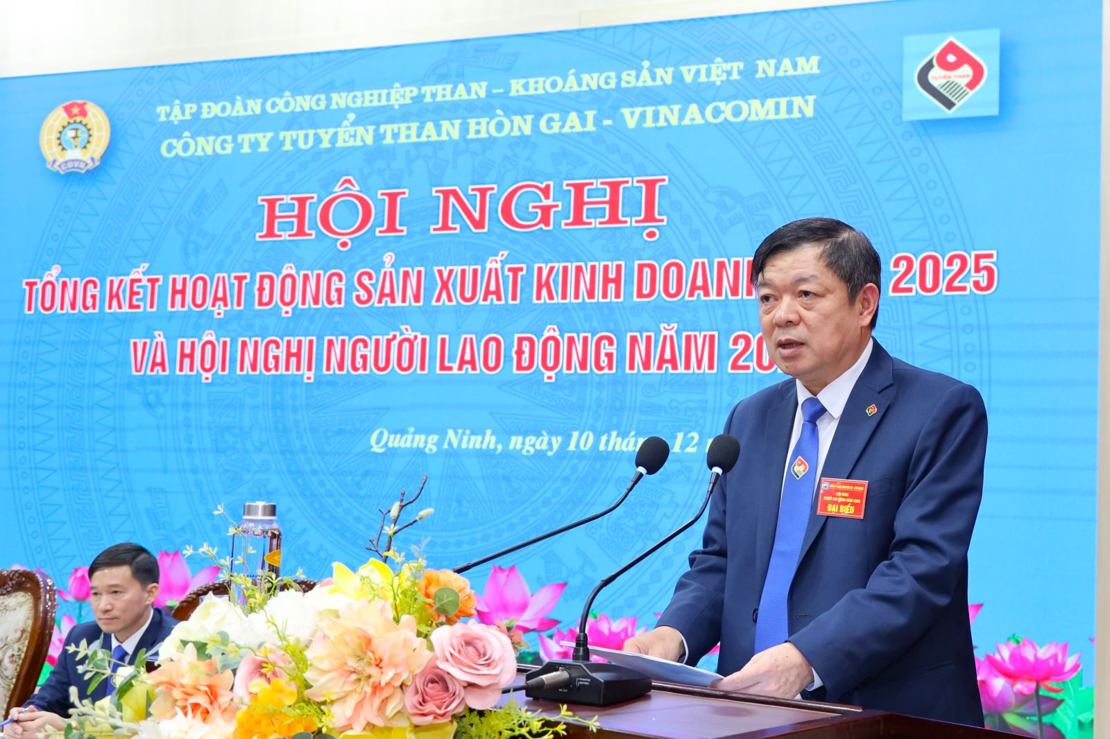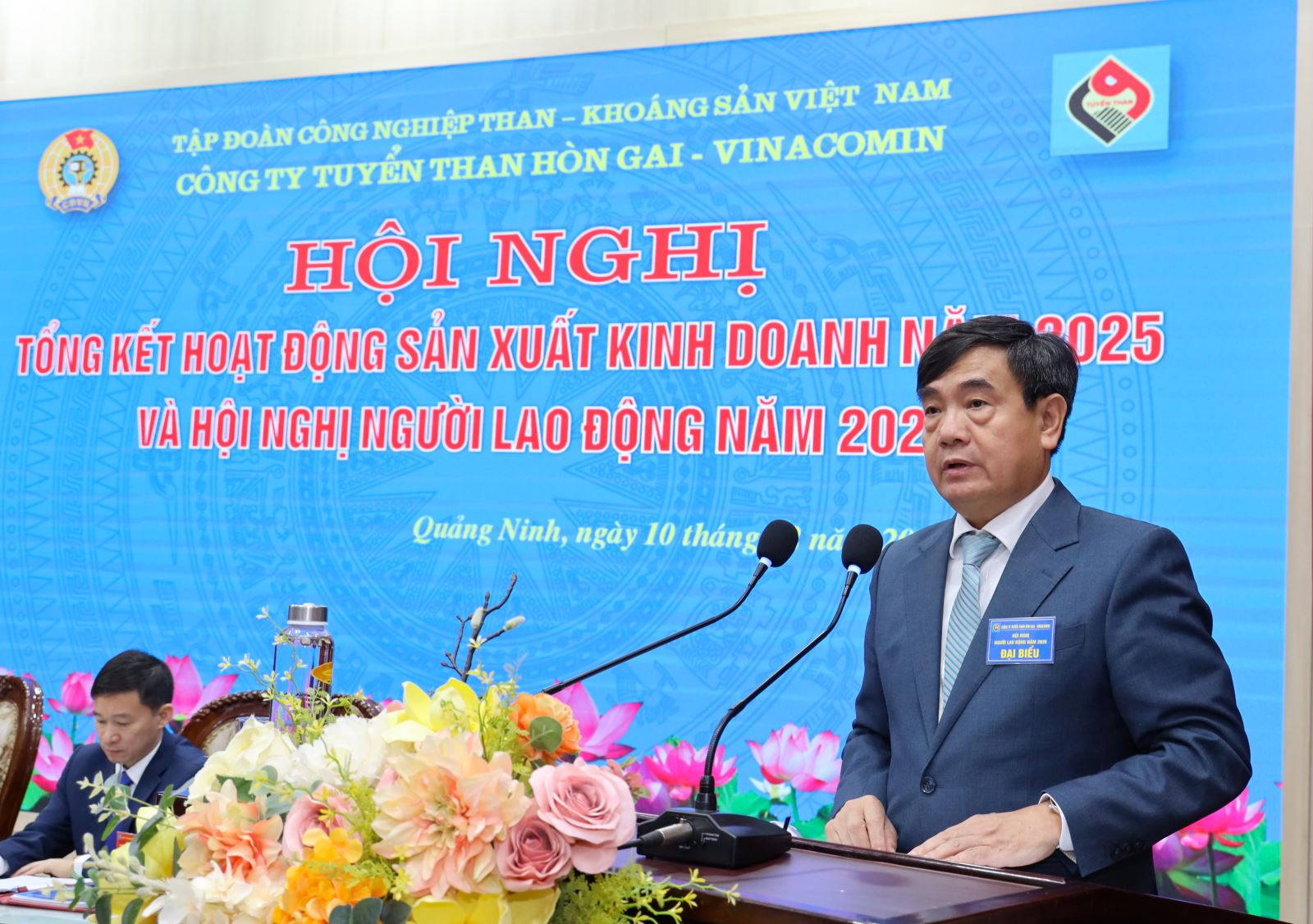 Phát biểu chỉ đạo tại Hội nghị, đồng chí Nguyễn Hoàng Trung - Thành viên HĐTV Tập đoàn ghi nhận và biểu dương những kết quả, thành tích mà Công ty đạt được trong năm 2025. Đồng chí nhấn mạnh, trong bối cảnh khó khăn chung, kết quả này thể hiện sự nỗ lực vượt bậc, tinh thần đoàn kết và ý thức trách nhiệm cao của tập thể CBCN Công ty. Đồng chí đề nghị Công ty năm 2026 tiếp tục tăng cường vai trò lãnh đạo của cấp ủy; chủ động bám sát kế hoạch SXKD; nâng cao chất lượng công tác an toàn - vệ sinh lao động; tăng cường dự báo, phòng ngừa rủi ro; đẩy mạnh cơ giới hóa, tự động hóa, chuyển đổi số; sớm hoàn thành đưa dự án băng tải của Công ty hoàn thành đi vào hoạt động và chuẩn bị tốt diện sản xuất cho các năm tiếp theo. Đồng chí tin tưởng Công ty sẽ hoàn thành thắng lợi các mục tiêu, góp phần đóng góp tích cực vào kết quả chung của Tập đoàn.