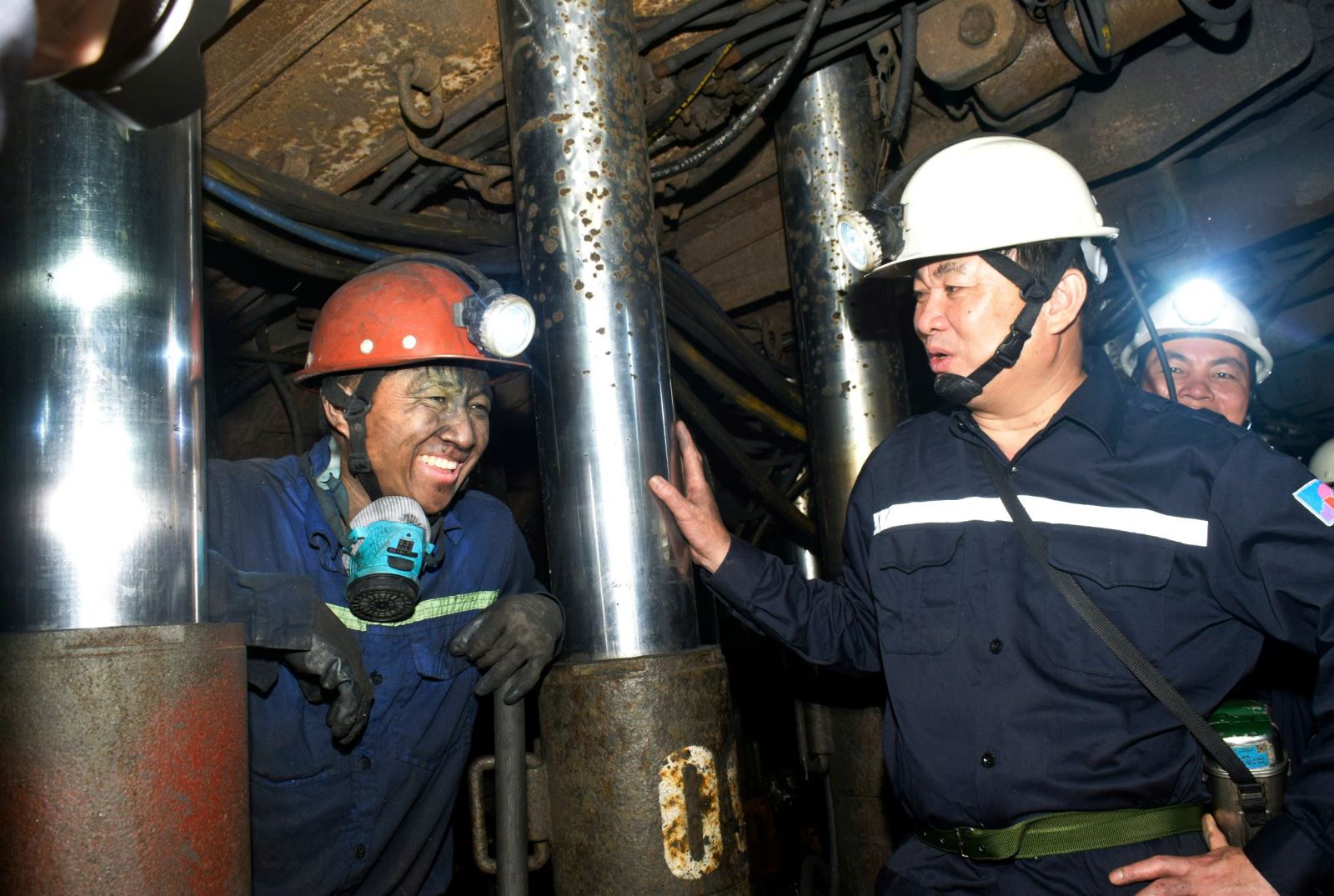 Đồng chí Ngô Hoàng Ngân - Bí thư Đảng ủy, Chủ tịch HĐTV Tập đoàn TKV động viên công nhân làm việc trong hầm lò