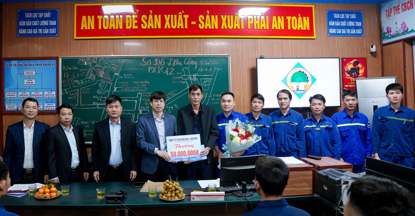 Đồng chí Trần Văn Thức - Phó Giám đốc Công ty trao thưởng đơn vị về nhất khối đào lò cho phân xưởng K12