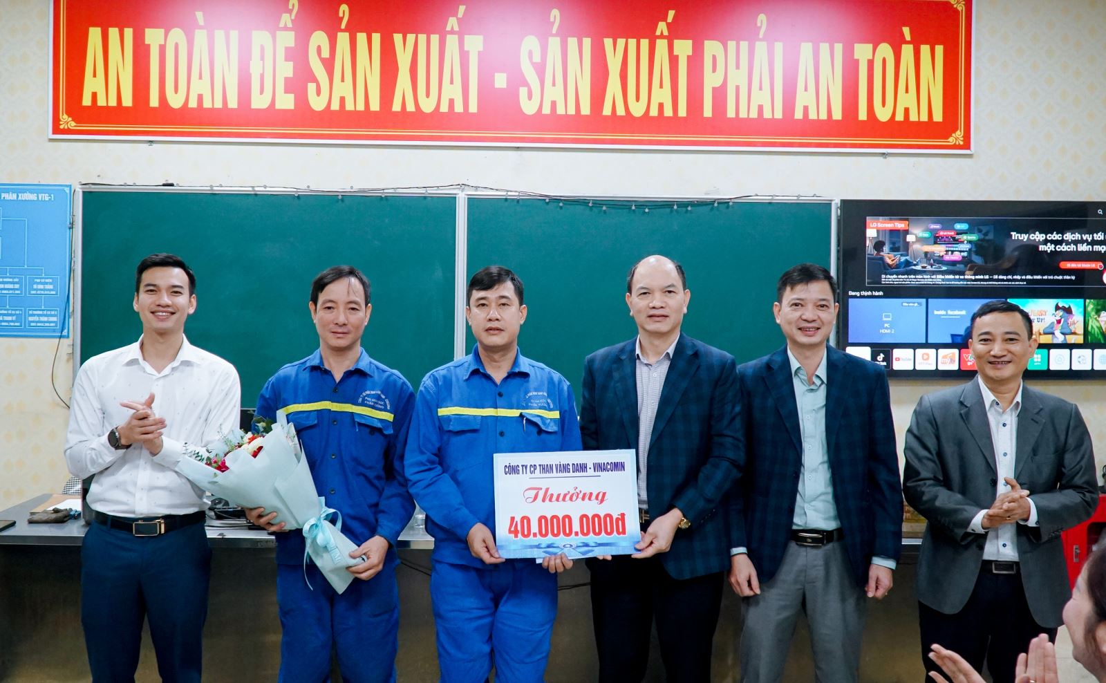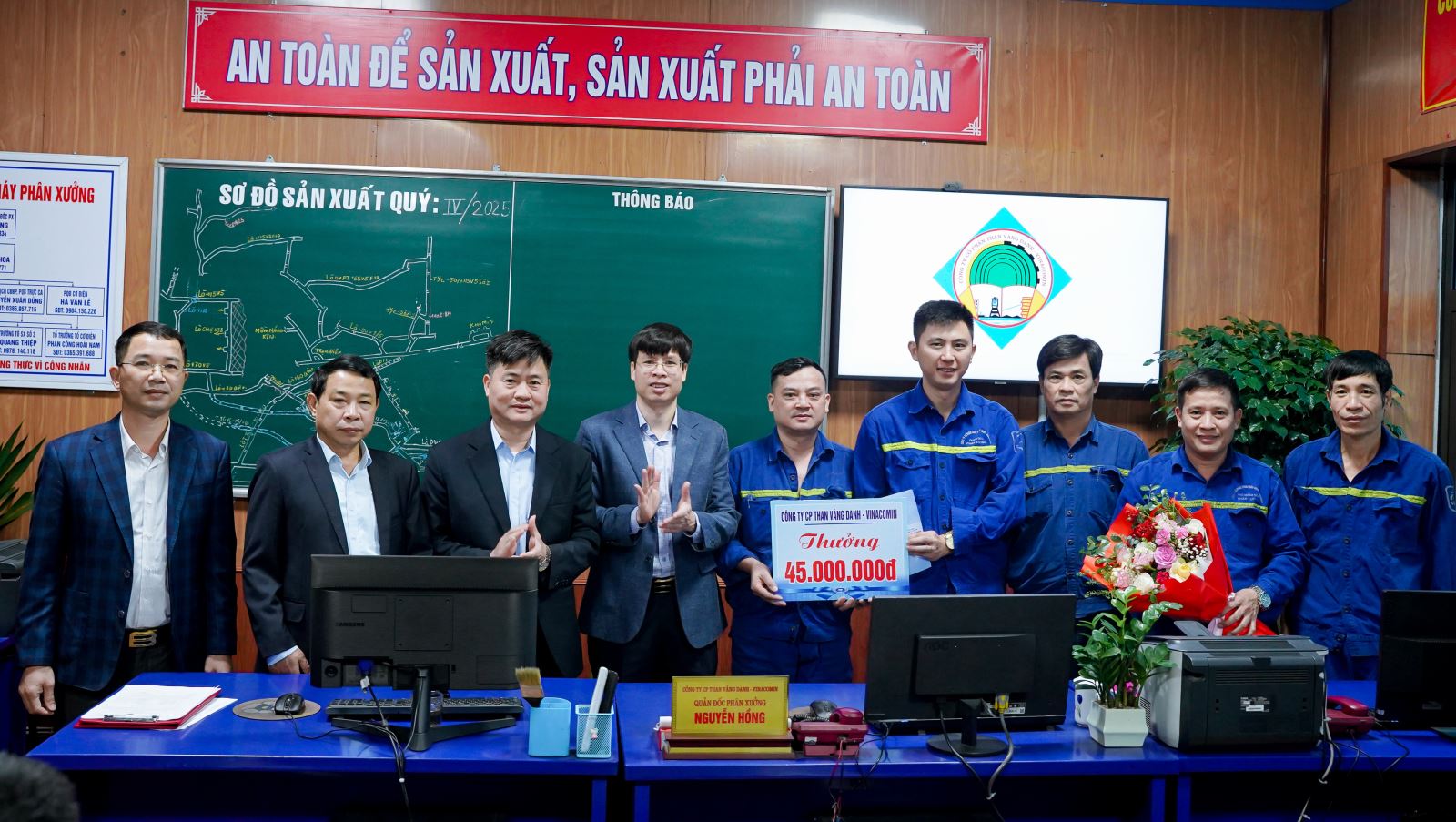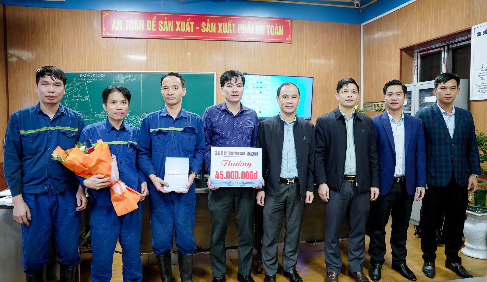 Đồng chí Trần Văn Thức - Phó Giám đốc Công ty trao thưởng đơn vị về nhất khối đào lò cho phân xưởng K13
