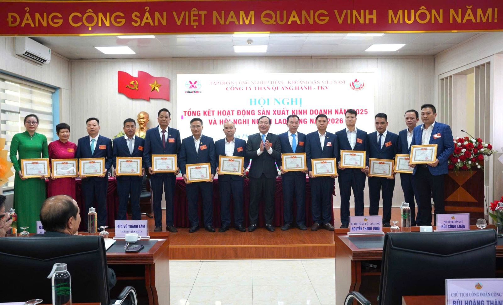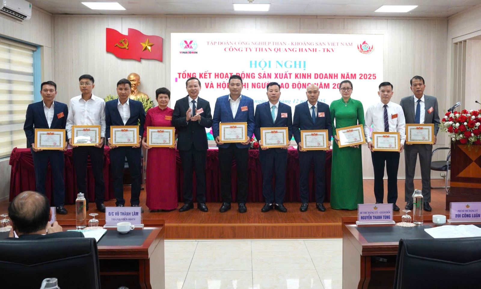 Ghi nhận những đóng góp to lớn và nỗ lực vượt bậc trong năm qua, hội nghị đã tổ chức khen thưởng cho các tập thể và cá nhân có thành tích tiêu biểu xuất sắc: trao tặng bằng khen của UBND tỉnh Quảng Ninh cho tập thể Ban CHQS Công ty Than Quang Hanh - TKV vì những thành tích xuất sắc trong công tác quốc phòng, quân sự địa phương. Đồng thời, Công ty đã trao tặng giấy khen và phần thưởng cho 13 tập thể và 10 cá nhân có thành tích xuất sắc trong phong trào thi đua hoàn thành kế hoạch SXKD năm 2025.