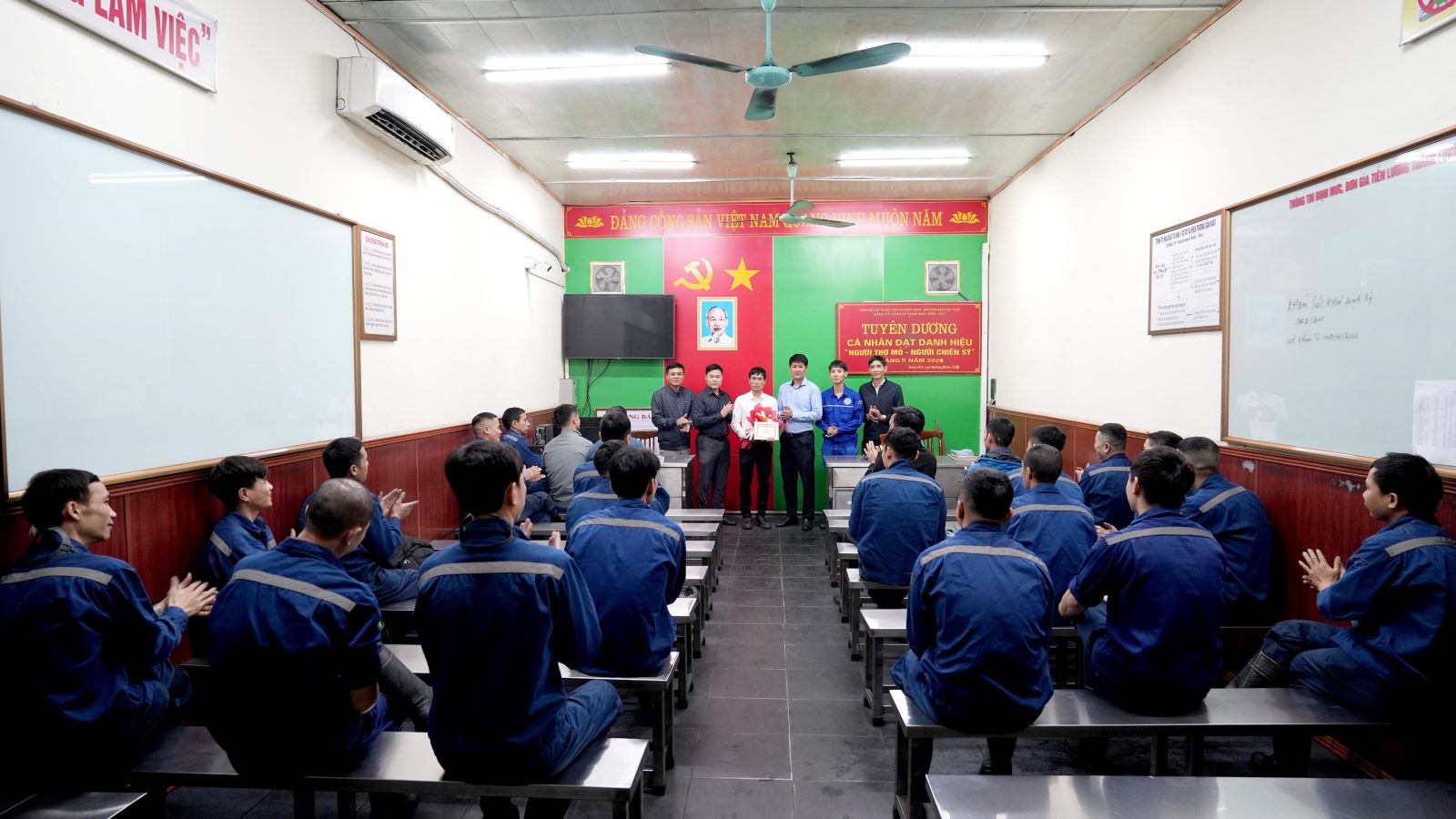 Vào đầu ca sản xuất, trước sự chứng kiến của tập thể CBCN đi ca 1 phân xưởng Khai thác 7, đồng chí Nguyễn Đức Hiệp - Trưởng phòng Tuyên giáo đảng uỷ đã trao tặng giấy chứng nhận cùng bó hoa tươi thắm chúc mừng anh Bùi Thanh Tuyền - thợ lò tiêu biểu của đơn vị. Trong thời gian vừa qua, anh Tuyền luôn được tập thể CBCNV đơn vị nhắc đến là công nhân có thành tích xuất sắc trong sản xuất. Không chỉ tham gia đảm bảo và vượt mức ngày công lao động, anh còn luôn tiên phong, gương mẫu trong việc tham gia đảm nhận phần việc khó, tạo sự lan tỏa tinh thần thi đua tại đơn vị. Anh là tấm gương sáng để anh em thợ trẻ học tập và tin yêu.