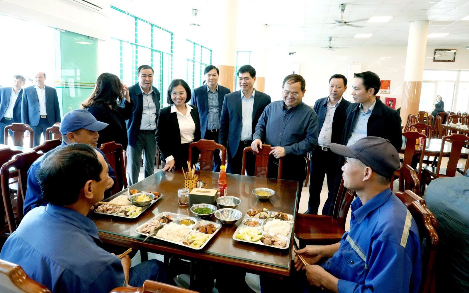 Đồng chí Quản Minh Cường, Bí thư Tỉnh ủy cùng lãnh đạo tỉnh Quảng Ninh thăm hỏi CNLĐ ăn ca tại nhà ăn công nghiệp