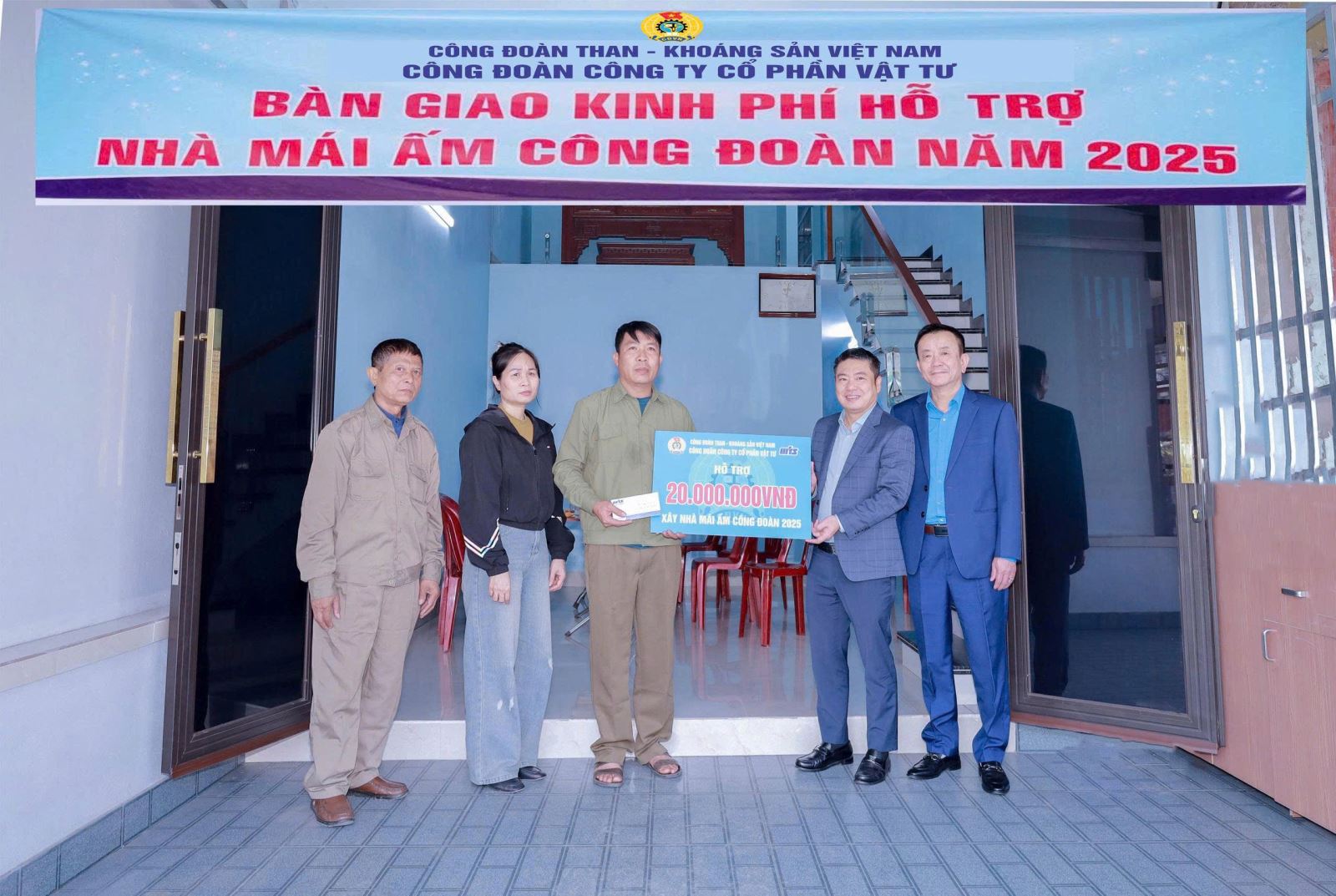 Sáng ngày 13/01, thừa uỷ quyền của Công đoàn Than - Khoáng sản Việt Nam, Ban lãnh đạo Công ty CP Vật tư do đồng chí Nguyễn Mạnh Toàn, Bí thư Đảng uỷ, Giám đốc Công ty; đồng chí Lê Dũng, Chủ tịch Công đoàn Công ty đã đến bàn giao kinh phí hỗ trợ nhà “Mái ấm Công đoàn” cho gia đình anh Nguyễn Hồng Cẩm, công nhân bảo vệ Đảo Thẻ Vàng, Phân xưởng Vận tải - Xếp dỡ.