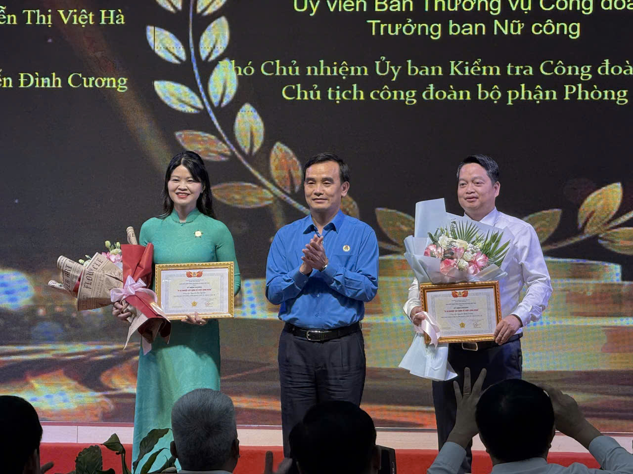 Chị Hà (bên trái) được Chủ tịch Công đoàn TKV trao kỷ niệm chương của TLĐLĐVN