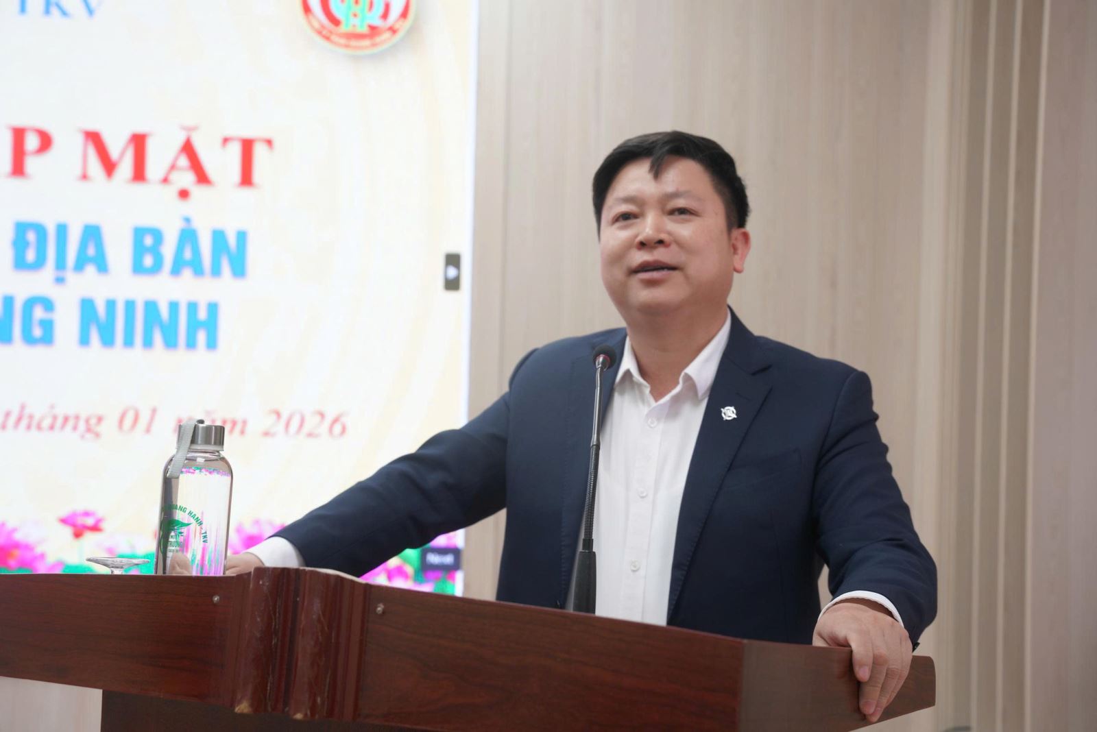 Đồng chí Nguyễn Văn Sỹ - Phó Giám đốc Công ty Than Quang Hanh phát biểu chia sẻ về nhu cầu tuyển dụng và các cam kết về môi trường làm việc cho các quân nhân