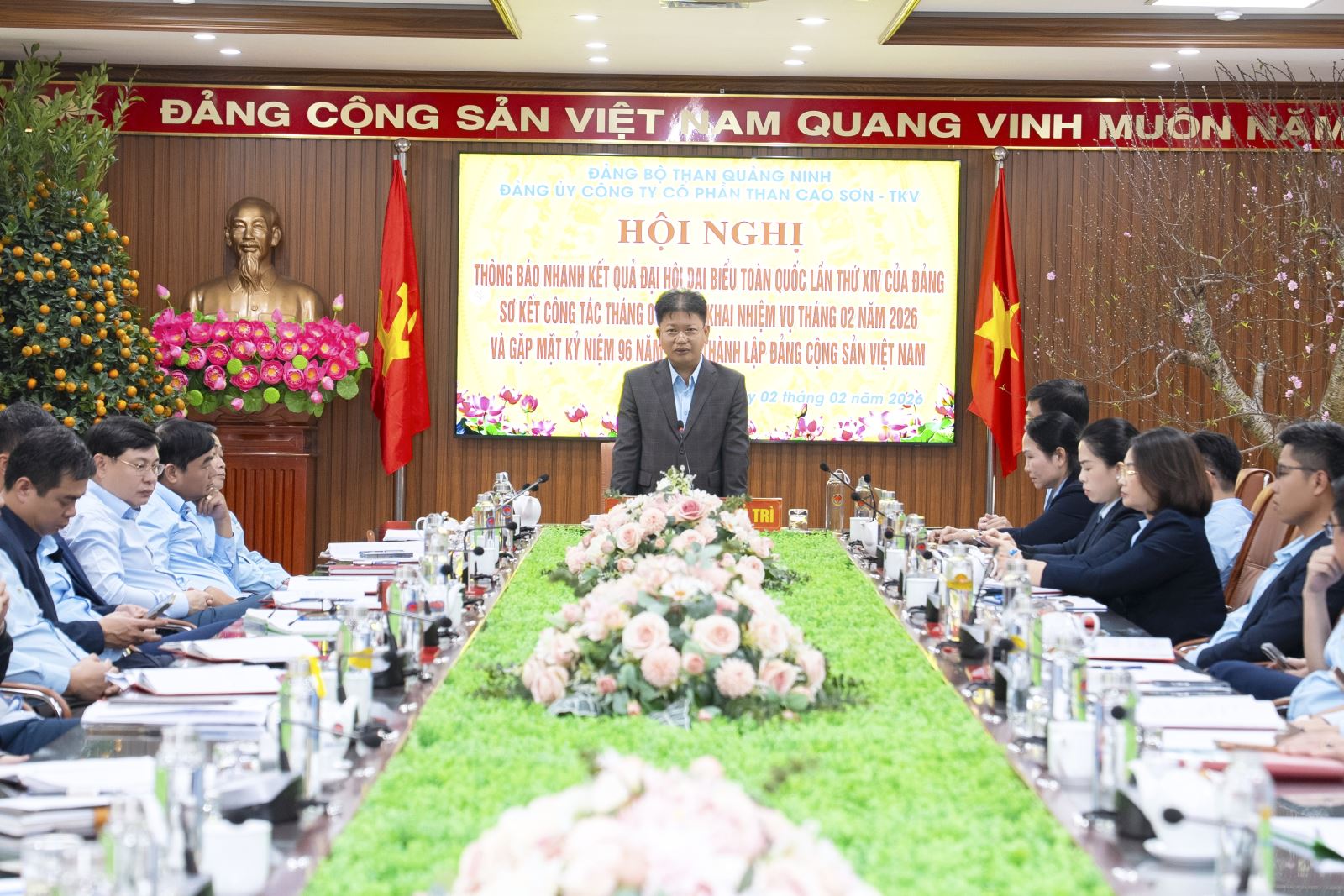Tại Công ty CP than Cao Sơn và Công ty than Dương Huy, các đơn vị đã tổ chức hội nghị thông báo nhanh kết quả Đại hội XIV đến đông đảo cán bộ, đảng viên, đồng thời tiến hành sơ kết hoạt động công tác Đảng tháng 01 và triển khai nhiệm vụ trọng tâm cho tháng 02/2026. Đây là dịp quan trọng để cán bộ, đảng viên, người lao động Công ty cùng ôn lại truyền thống vẻ vang của Đảng, khơi dậy niềm tự hào và ý chí quyết tâm hoàn thành tốt các chỉ tiêu sản xuất ngay từ những tháng đầu năm.