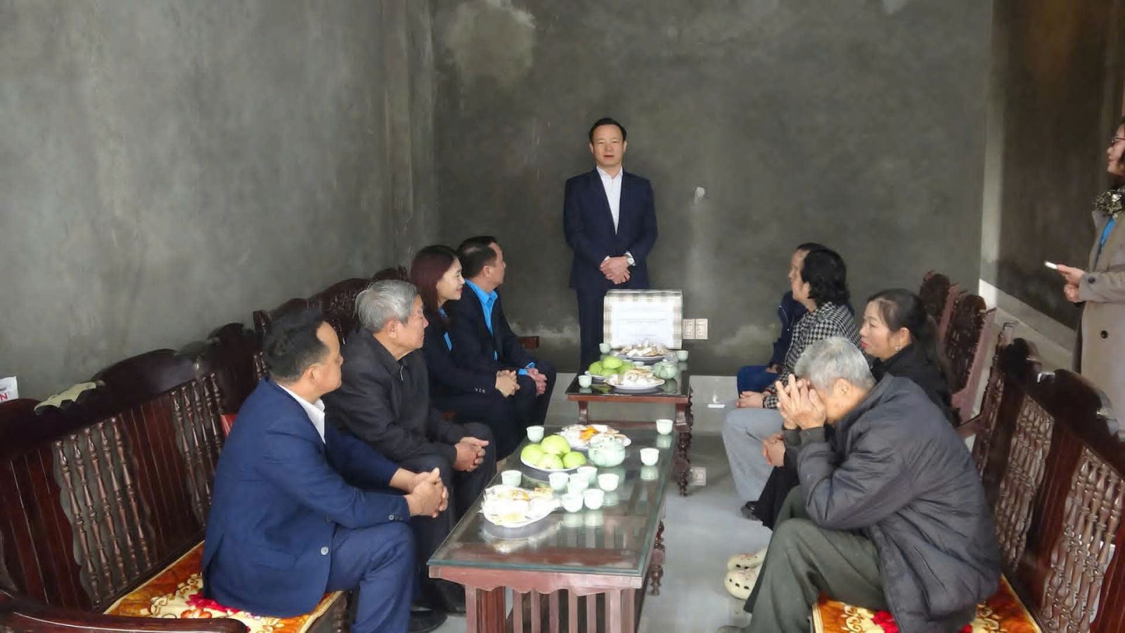 Đại diện lãnh đạo Tổng công ty và Công đoàn Tổng Công ty Hóa chất mỏ trao tiền hỗ trợ cho 02 gia đình có đồng chí Trịnh Hải Cương - Phó Bí thư Đảng ủy, Phó Tổng Giám đốc, Chủ tịch Công đoàn Tổng công ty cùng với đồng chí Thường trực Công đoàn TCT, BCH Công đoàn 02 đơn vị.