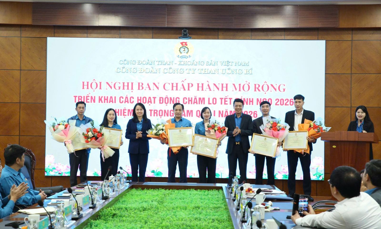 Chị Huệ (đứng thứ hai bên phải) nhận bằng khen của Công đoàn TKV