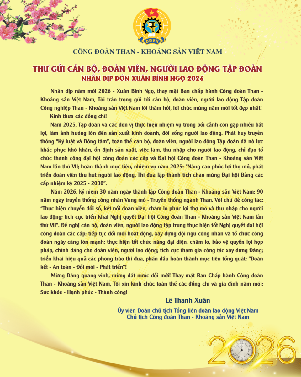Thư gửi cán bộ, đoàn viên, người lao động Tập đoàn nhân dịp đón Xuân Bính Ngọ 2026