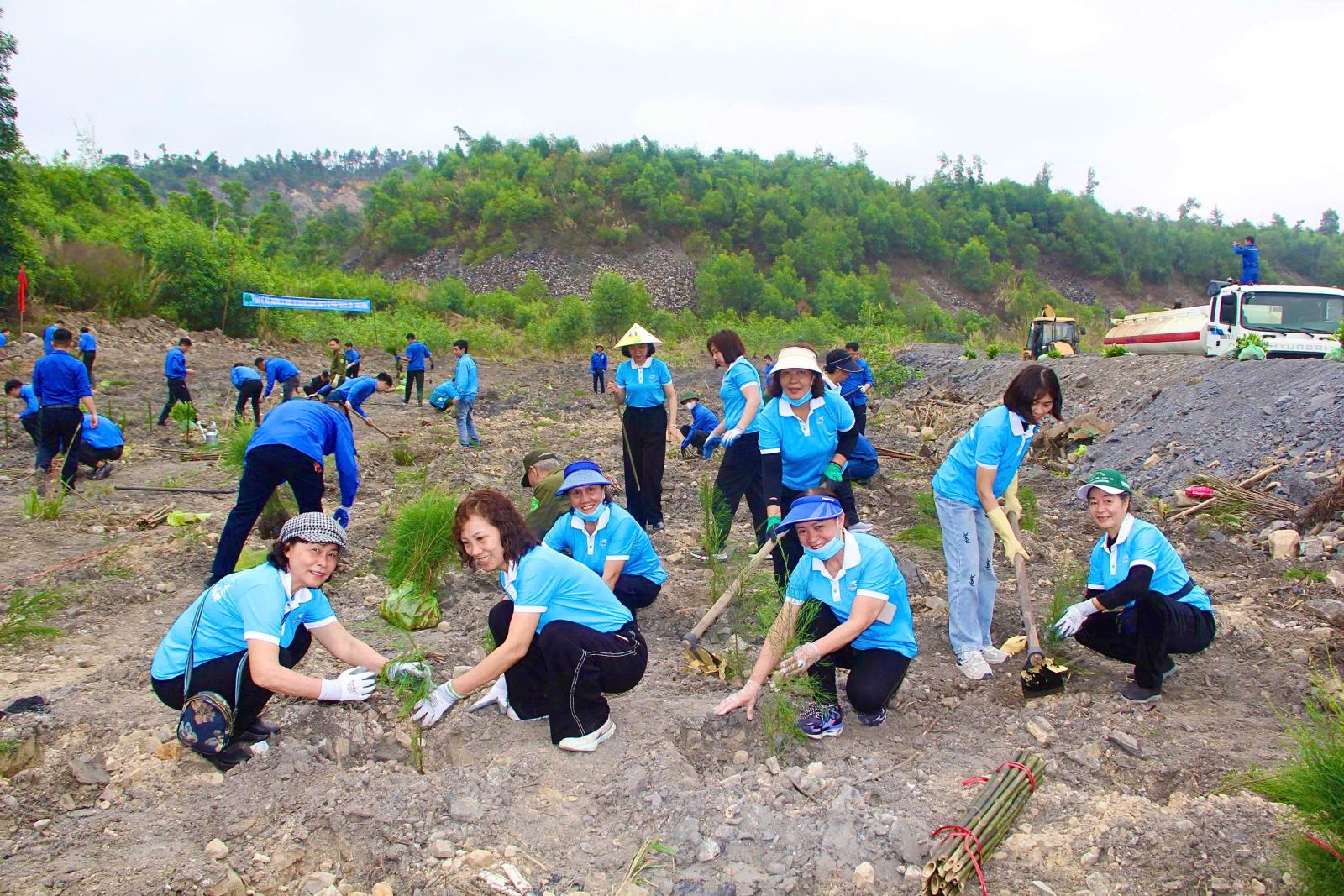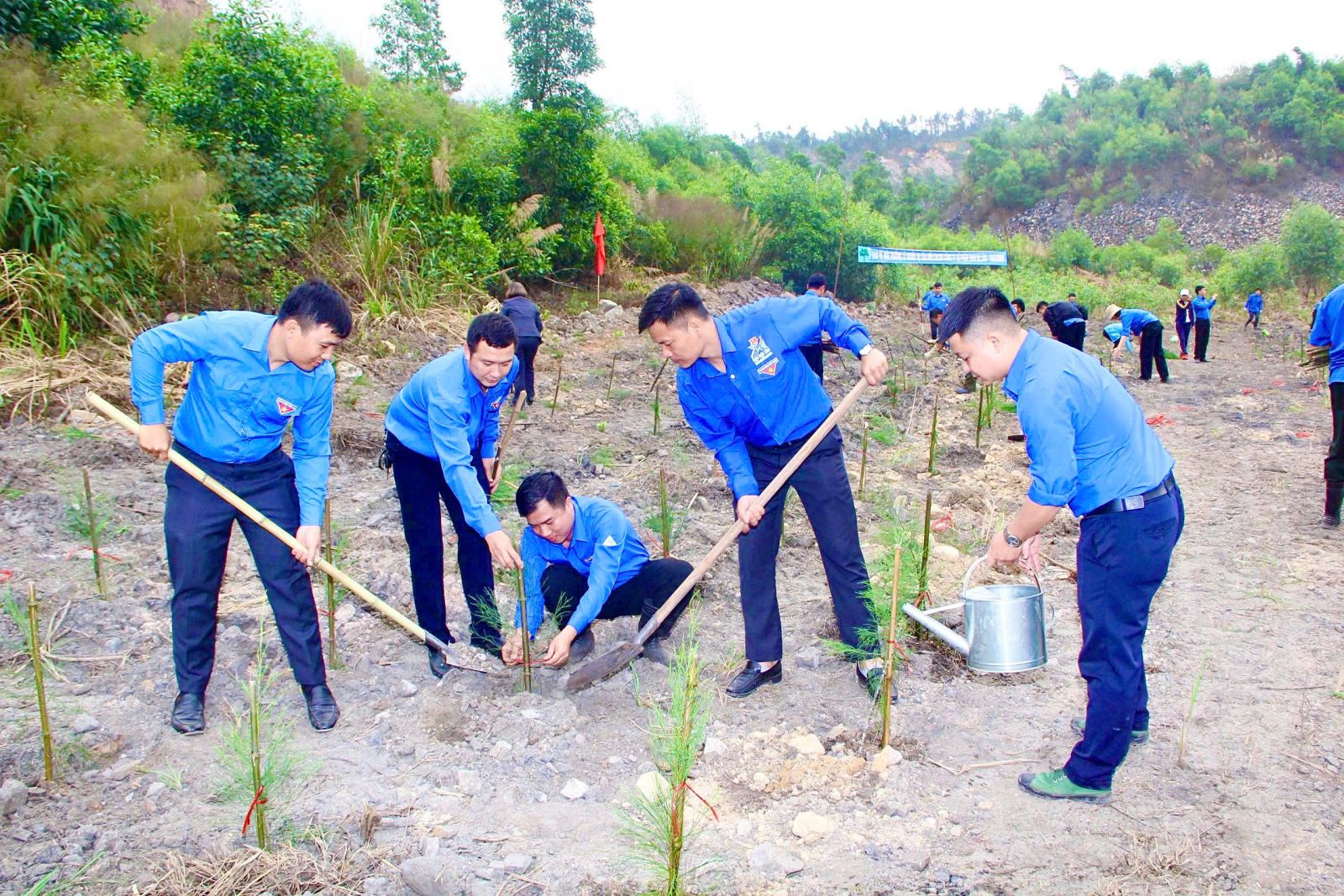 Các đại biểu và lực lượng ĐVTN Công ty, dân quân phường Hà Lầm tham gia trồng cây