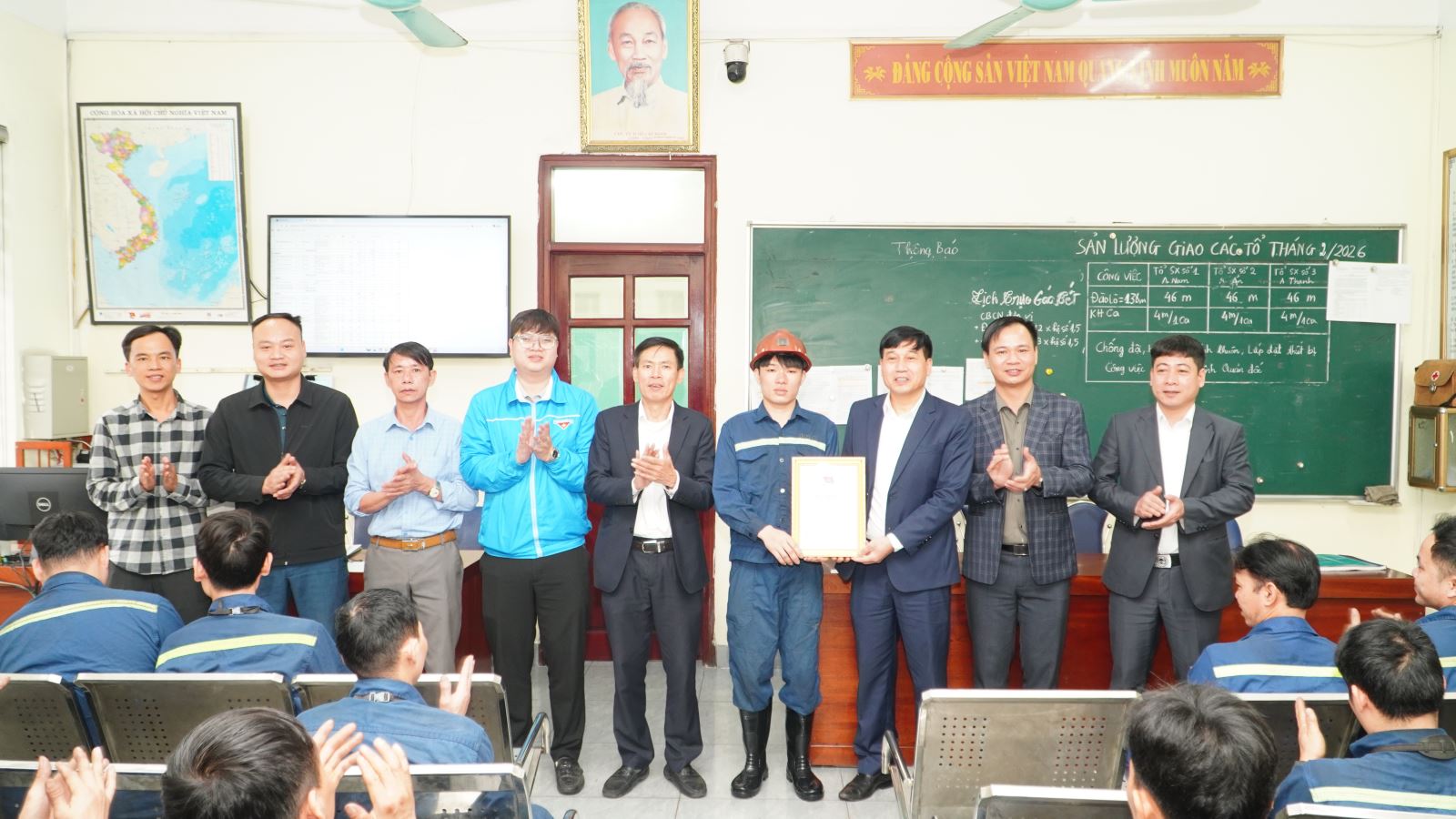 Sáng ngày 24/02/2026, Đại diện cho Đảng ủy, Công đoàn, Đoàn thanh niên Công ty, các phòng chuyên môn, đoàn do đồng chí Vũ Quang Tuyến - Phó bí thư thường trực Đảng ủy Công ty làm trưởng đoàn đã trực tiếp đến nhà nhận lệnh sản xuất các đơn vị thực hiện việc công bố và biểu dương gương “Người thợ mỏ - Người chiến sỹ” tháng 1 năm 2026 cho các đồng chí: Bùi Văn Quân - Công trường KTĐL5, Nguyễn Quốc Khánh - Công trường KTĐL7, Cao Đình Khang - Công trường KTĐL9, Nguyễn Đức Phú - Công trường KTĐL11, Vũ Anh Tuấn - Công trường KTĐL12, Lò Văn Kỷ - Công trường KTĐL15, Lý A Thiểu - Công trường KTĐL17.
