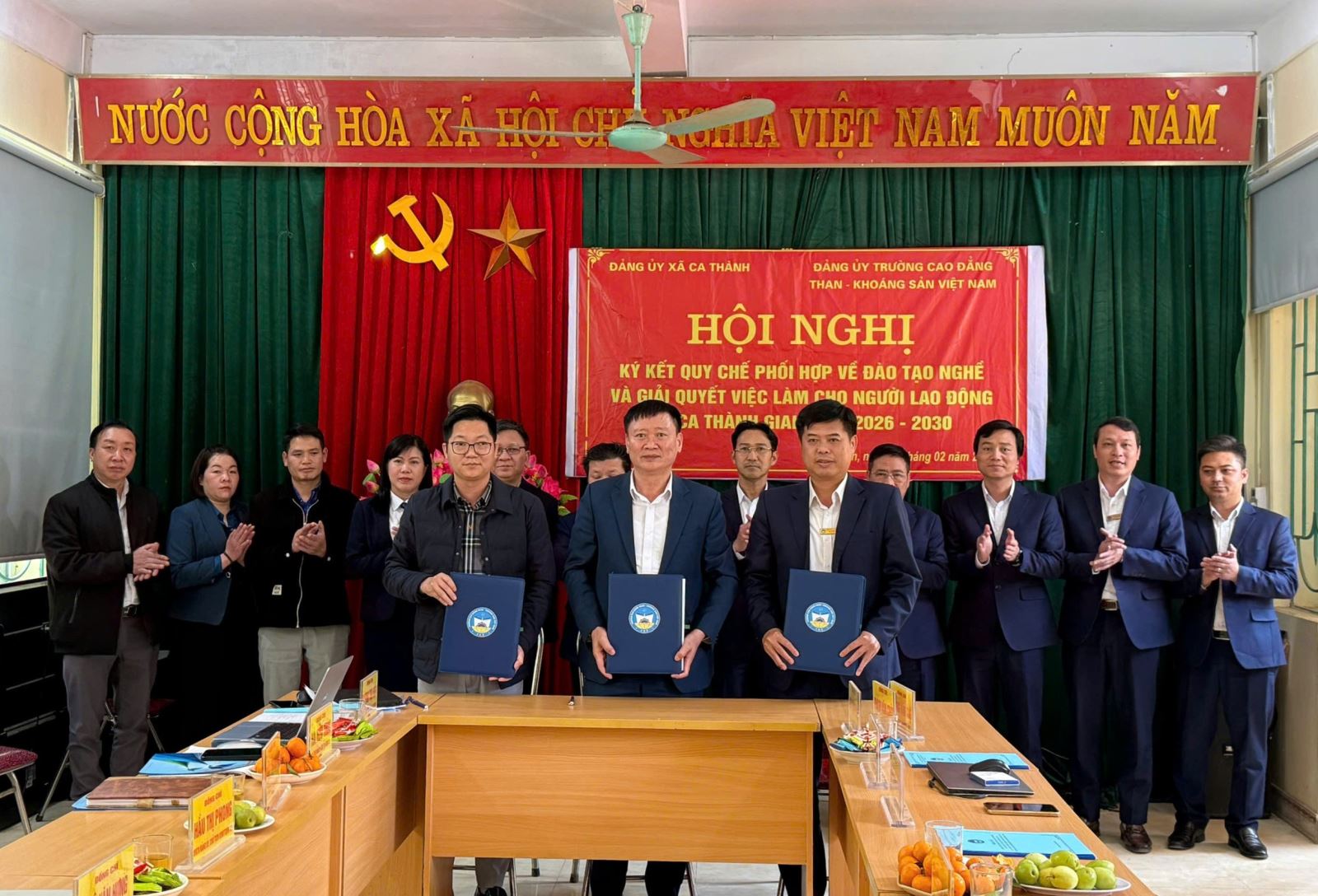 Sau khi đánh giá cao sự chủ động của Công ty và Nhà trường trong việc kết nối đào tạo việc làm, đại diện cấp ủy và chính quyền xã Khánh Xuân và Ca Thành đã tham gia ký kết quy chế phối hợp, thống nhất đẩy mạnh công tác tư vấn hướng nghiệp, tạo điều kiện thuận lợi để thanh niên địa phương học tập và làm việc lâu dài tại Tập đoàn và Công ty Cổ phần Than Núi Béo.