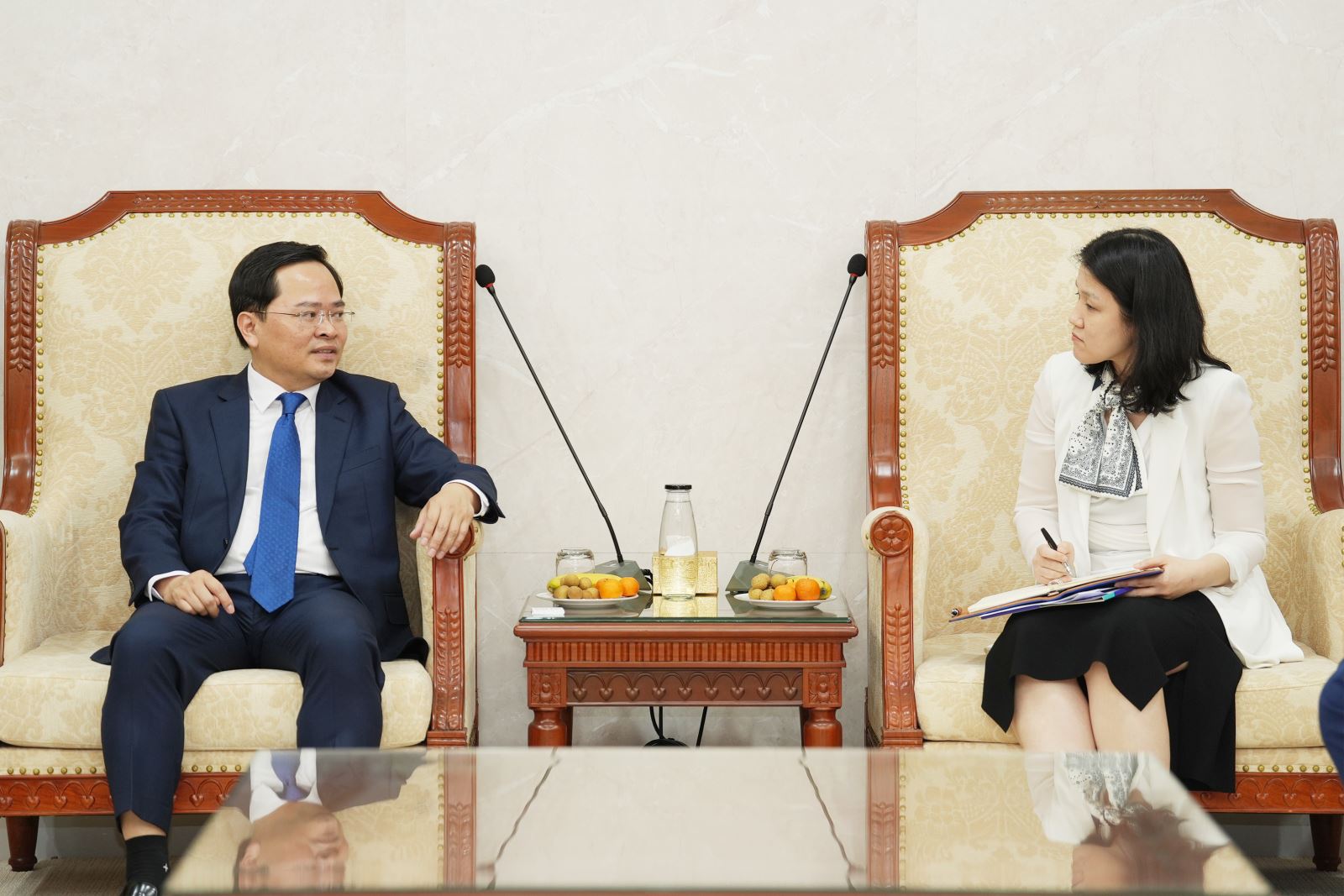 Ông Nguyễn Anh Tuấn - Ủy viên Trung ương Đảng, Bí thư Đảng ủy, Chủ tịch Tổng LĐLĐVN và bà Park Sinwon - Giám đốc Văn phòng ILO tại Việt Nam trao đổi các nội dung 2 bên cùng quan tâm. Ảnh: Hữu Chánh