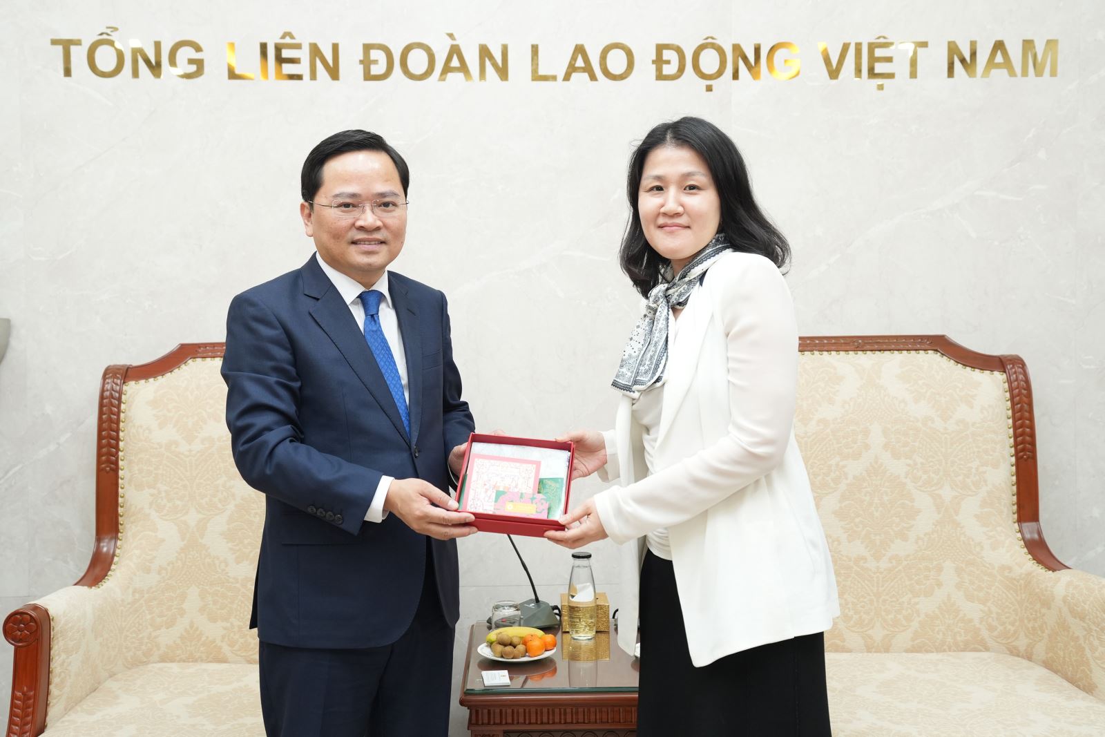 Bà Park Sinwon - Giám đốc Văn phòng ILO tại Việt Nam trao tặng lưu niệm cho ông Nguyễn Anh Tuấn - Ủy viên Trung ương Đảng, Bí thư Đảng ủy, Chủ tịch Tổng LĐLĐVN. Ảnh: Hữu Chánh