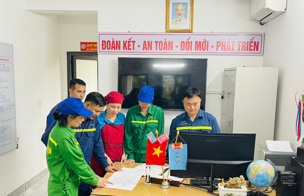 Chị Thanh (ngoài cùng bên trái) đang đề xuất nghiên cứu cải tiến kỹ thuật, hợp lý hóa sản xuất tại đơn vị