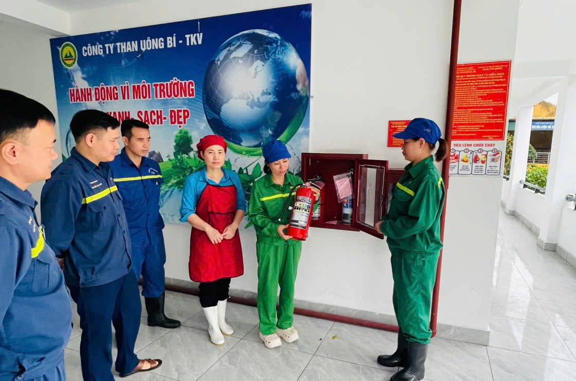 Chị Thanh (người cầm bình dập lửa) đang hướng dẫn cho người lao động sử dụng thiết bị dụng cụ phương tiện PCCC tại nơi làm việc
