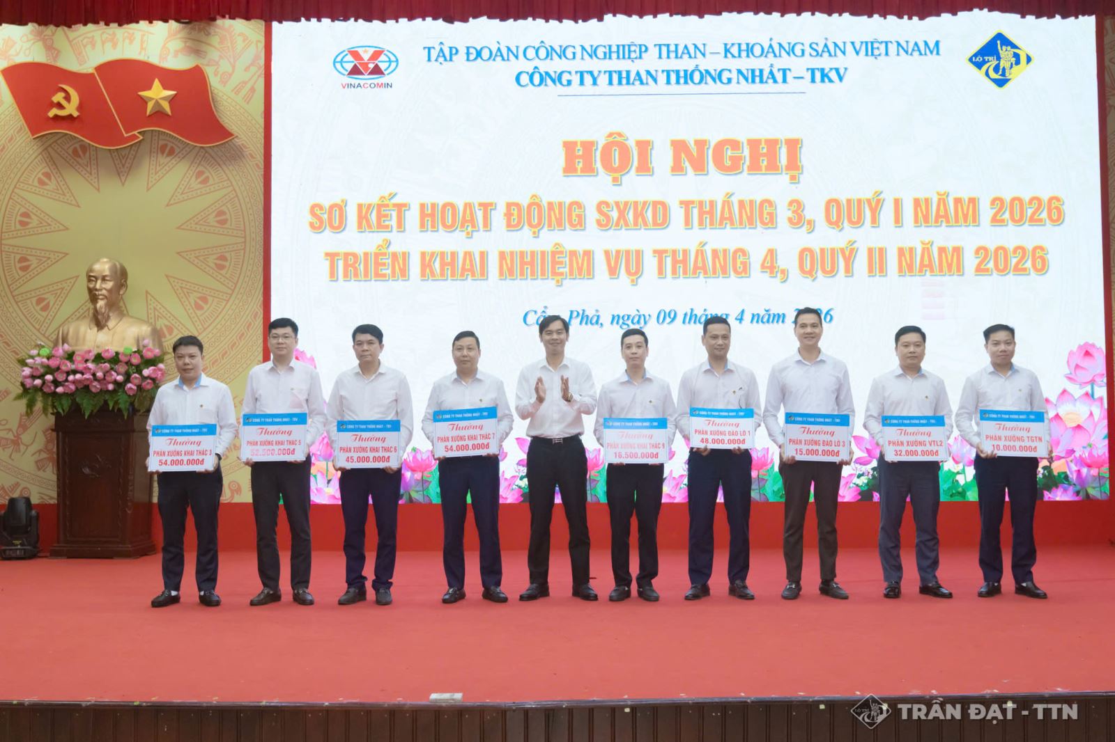 Chiều ngày 09/4/2026, Công ty Than Thống Nhất đã tổ chức Hội nghị sơ kết công tác sản xuất kinh doanh tháng 3, quý I, triển khai nhiệm vụ tháng 4, quý II năm 2026. Tham dự hội nghị có đồng chí Vương Minh Thu - Bí thư Đảng ủy, Giám đốc Công ty cùng các đồng chí trong Ban Giám đốc Công ty; các đồng chí lãnh đạo Đảng uỷ, Công đoàn, Đoàn thanh niên Công ty; Thủ trưởng các đơn vị cùng các đại biểu là CNCB tiêu biểu xuất sắc quý I/2026.