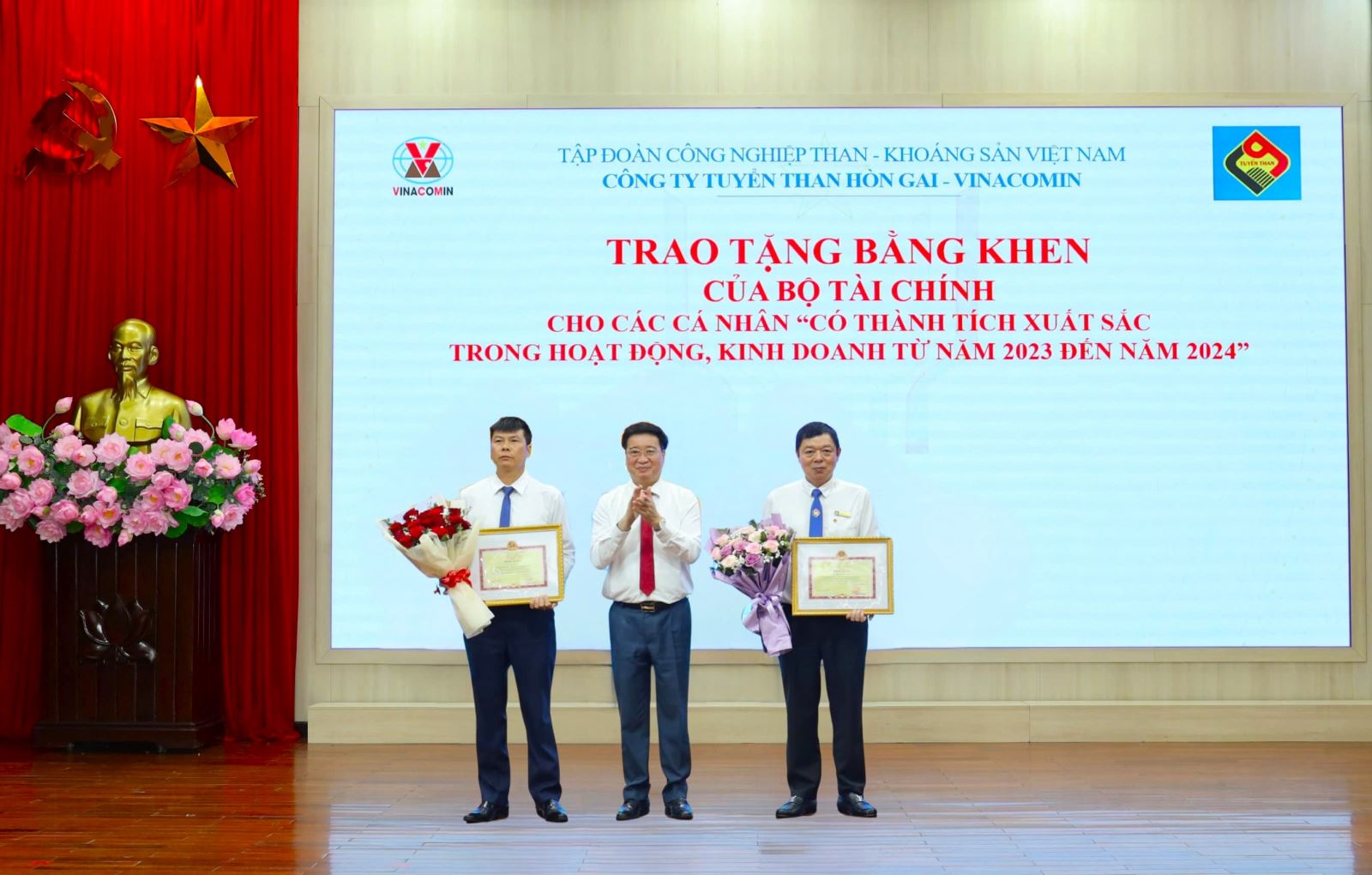 Đồng chí Bùi Văn Ngợi - Phó bí thư Đảng ủy Than QN trao Bằng khen của Bộ Tài chính cho 02 cá nhân xuất sắc trong hoạt động SXKD giai đoạn 2023-2024