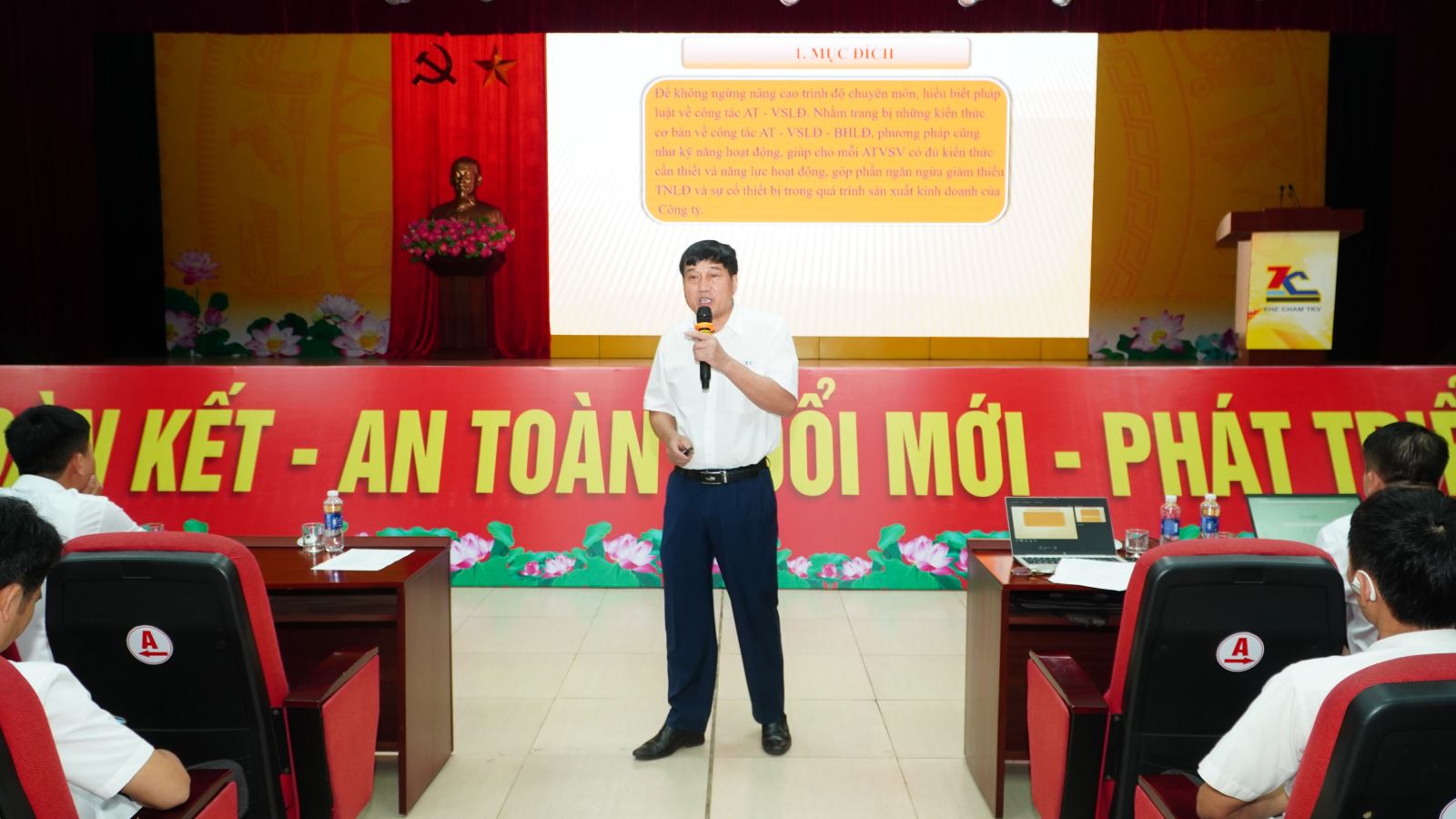 Đồng chí Nguyễn Duy Thái - Chủ tịch Công đoàn công ty truyền đạt các nội dung về quyền, trách nhiệm và phương pháp hoạt động của mạng lưới ATVSV
