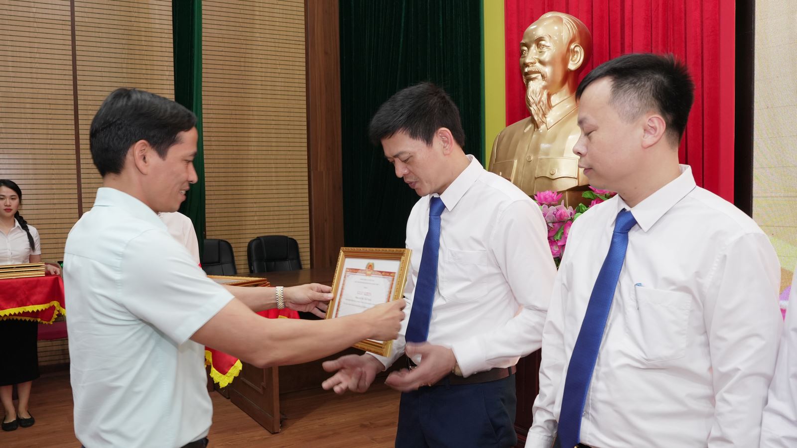 Thừa ủy quyền của Đảng ủy than Quảng Ninh, đồng chí Nguyễn Văn Dũng - Bí thư Đảng ủy, Chủ tịch HĐQT Công ty trao giấy khen của Đảng ủy TQN cho Bùi Thế Tuyền - Đảng viên HTSXNV 5 năm liền