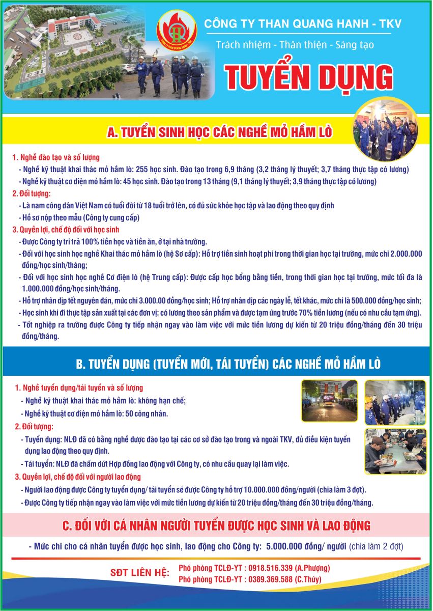 Đối với người lao động được tuyển dụng, Công ty ưu tiên tuyển những lao động có bằng nghề được đào tạo các nghề mỏ hầm lò như khai thác mỏ hầm lò, cơ điện mỏ hầm lò, đáp ứng đầy đủ điều kiện tuyển dụng theo quy định của pháp luật, của TKV và của Công ty. Đối với lao động tái tuyển, áp dụng với người lao động đã có bằng nghề mỏ hầm lò, đã chấm dứt hợp đồng lao động với Công ty nhưng nay có nhu cầu quay trở lại làm việc.